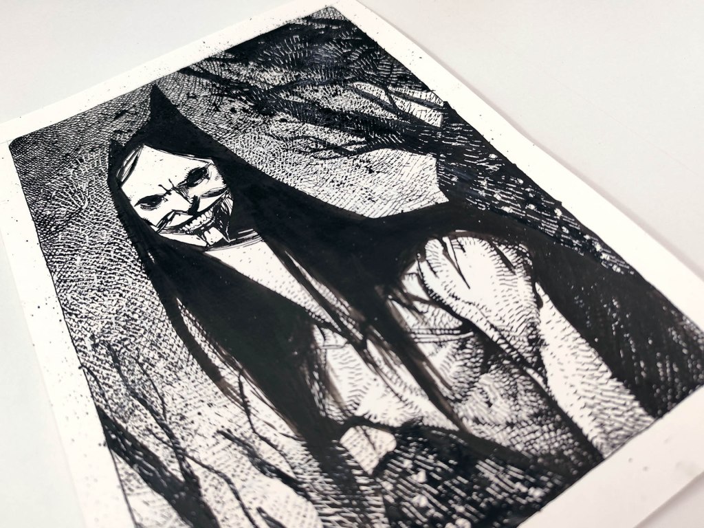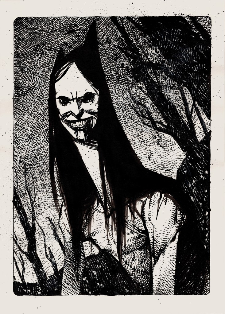 This illustration was inspired by figures I encounter in lucid dreams, ever since early childhood. They behave autonomously – as if they had their own will and identity, independent from mine. They often have unnaturally elongated body proportions and smile too widely – in a way that is physically impossible, yet undeniably real in that world.